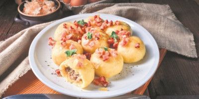 Propržiti iseckan crni luk, dodati meso, pa dinstati dok ne dobije lepu boju. Začiniti po ukusu i prohladiti. Krompir skuvati, izgnječiti, pomešati sa istopljenim maslacem, pa dodati brašno, griz i žumanca. Sve dobro sjediniti. Testo rastanjiti, čašom izvaditi krugove, te svaki filovati i rukama formirati knedle. Kuvati u slanoj vodi desetak minuta. U međuvremenu u tiganju propržiti slaninu isečenu na kockice. Knedle ocediti, posuti slaninom, pa poslužiti.