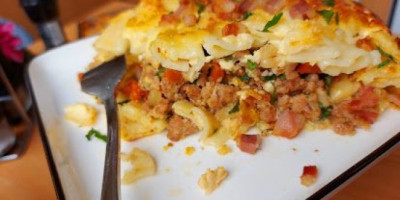 Preko nje istresti mleveno meso i prekriti ostatkom testenine. U činiju razbiti dva jaja dodati dve kašike rendanog kačkavalja i 100 ml, jogurta.
