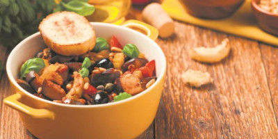 Patlidžane iseći na manje kocke, posoliti ih i ostaviti da kratko odstoje. Paralelno u velikom tiganju zagrejati ulje i ispržiti prethodno sitno iseckan luk. Tokom prženja dodati malo vode da luk omekša, pa ga pobiberiti. U tiganj dodati iseckan paradajz i pržiti dok se smesa ne sjedini. Zatim patlidžane sa celerom umešati u umak od paradajza, dodati maslinke, kao i oceđen kapar. Sve sastojke izmešati i začiniti šećerom, suvim začinom i sirćetom. Dodati pinjole i sitno seckanu ljutu papričicu, posuti bosiljkom, te odmah poslužiti.