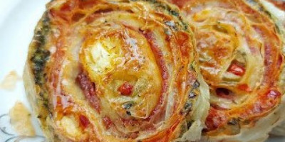 Prvu koru premazati uljem pa preko nje dodati drugu, i nju premazati sa prvim delom sira i posuti isečenim maslinkama. Saviti ivice i uviti u rolat. Ostaviti sa strane. Opet raširiti koru jednu premazati uljem pa prekriti drugom i nju premazati drugim delom sira a preko prekriti šunkom .