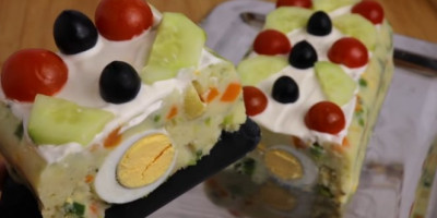 Skuvajte krompir i napravite pire. Posolite i pobiberite, pa dodajte majonez. Sve sjedinite, a zatim dodajte kuvanu seckanu šargarepu i grašak, peršun, papriku, kukuruz i masline, pa promešajte. Sipajte pola smese u kalup obložen providnom folijom, a zatim stavite cela kuvana jaja, pa ostatak smese. Pokrijte providnom folijom, pa ostavite u frižideru nekih 2 sata. Dekorišite po želji. U videu je vrh torte premazan majonezom, pa poređane crne masline, seckani krastavac i čeri paradajz.