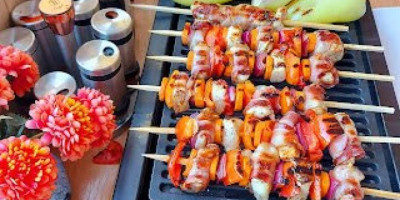 Povrće takodje iseći na kocke i posoliti i dodati malo ulja pa izmešati. Komad mesa umotati u list slanine pa probosti štapićem.