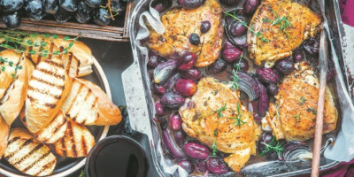 Rernu zagrejati na 200 stepeni. U vatrostalnu činiju ubaciti očišćeno i oprano grožđe, na rebarca isečen crveni luk, majčinu dušicu i ulje, pa sve dobro izmešati rukama. Odozgo poslagati pileće karabatake, posoliti i pobiberiti, pa peći oko 25-30 minuta, odnosno dok meso ne bude gotovo. Pojačati temperaturu na 240 stepeni, peći još pet minuta, da se uhvati korica, pa poslužiti.