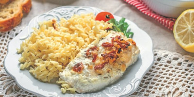 Pileći file posoliti i pobiberiti, pa ga kratko propržiti u tiganju na zagrejanom maslacu i ulju, da porumeni sa svih strana. Potom sve prebaciti u manju vatrostalnu činiju, preliti pavlakom za kuvanje prethodno pomešanom s parmezanom i mocarelom, posuti iseckanom slaninom, te zapeći u rerni na 200 stepeni oko 20 minuta.