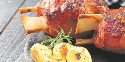 Beli luk i ruzmarin sitno iseckati, pomešati, pa dobro utrljati u svinjske kolenice. Posoliti, pobiberiti, preliti maslinovim uljem i još jednom sve utrljati. Kolenice ostaviti da odstoje barem dva sata. Zagrejati rernu na 200 stepeni. Kolenice staviti u podmazan pleh, pa ih peći oko sat vremena. Zatim smanjiti temperaturu na 180 stepeni i peći još sat vremena, uz povremeno okretanje i prelivanje vinom.