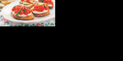 Stavite po kašičicu paradajza. Bruskete poređajte u pleh, na svaki dodajte iseckane maslinke. Pecite u rerni zagrejanoj na 200 stepeni oko deset minuta.
