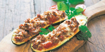 Poređajte iseckanu pršutu na kockice, ponovo sipajte smesu i preko izrendajte gaudu. Pleh za pečenje premažite maslinovim uljem, pa poređajte punjene tikvice.
