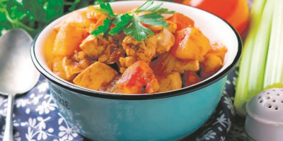Tofu ocediti, prosušiti, iseći na kocke, pa kratko propržiti u šerpi na zagrejanom ulju. Dodati iseckan beli luk, supu, šećer, paradajz pire, ruzmarin i lovor. Kad proključa, smanjiti vatru i mešati 20 minuta. Potom dodati iseckano povrće, posoliti i pobiberiti, pa krčkati još 40 minuta uz povremeno mešanje. Posuti peršunom i poslužiti.