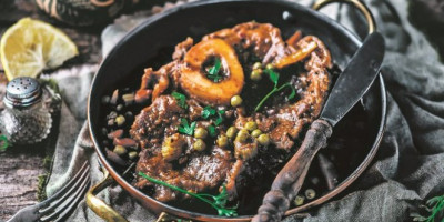 Zamoliti mesara da teleću kolenicu iseče na četiri deblje šnicle, pa ih posoliti, pobiberiti, začiniti italijanskim začinima i uvaljati u brašno. U većem tiganju na zagrejanom ulju pržiti meso po četiri minuta sa svake strane, te prebaciti u podmazan pleh. U tiganju potom propržiti na četvrtine isečen crni luk, pa i njega staviti u pleh sa mesom. Peći u rerni na 200 stepeni 30 minuta. U međuvremenu prethodno natopljene šitake ocediti i kratko propržiti u tiganju. Dodati đumbir, soja sos, žalfiju i vino. Krčkati pet minuta, preliti meso, prekriti folijom, smanjiti vatru na 160 stepeni i peći još 90 minuta. Na kraju dodati grašak, peći još 15 minuta, pa poslužiti.