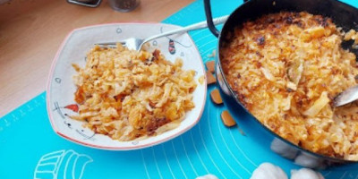 3. Oprati pirinač pa ubaciti . Beli luk očistiti i iseckati, pa pola staviti u ribu a pola u kupus. U zemljani sud, može i šerpa, sipati pola kupusa, pa istresti ribu odozgo. Nakon toga, prekriti rubu sa ostakom kupusa. Potom bi trebalo da poravnate sastojke, pa sipajte dve čaše vode. Zapeći u rerni oko 50 min. na 220 stepeni.