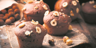U većoj činiji pomešati brašno, kakao, sodu bikarbonu i so. U drugoj činiji mikserom umutiti ulje, jaja, mleko, kiselu pavlaku, vanilu i šećer. Sjediniti obe smese, umešati iseckanu čokoladu, pa sipati u podmazane kalupe za mafine. Odozgo rasporediti lešnike i blago ih utisnuti u smesu. Peći u rerni na 200 stepeni oko 20 minuta.