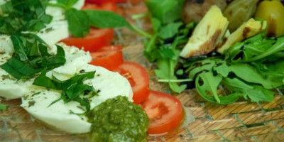 Kriške hleba premazati pesto sosom. Paradajz oprati i iseći na tanje kolutove. Mocarelu takođe iseći na kolutove.