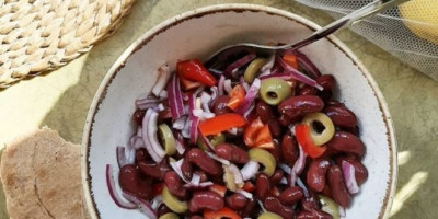 Papriku iseckajte na kockice, crveni luk na režnjeve, a masline na kolutove pa sve to dodajte pasulju.