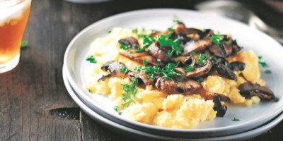 Palentu skuvati u posoljenoj ključaloj vodi, prema uputstvu s pakovanja. Kad je palenta gotova, premestiti je u adekvatnu posudu i ostaviti da se malo prohladi. U međuvremenu u tiganju na malo zagrejanog maslaca propržiti sitno seckani crni luk, dodati izgnječeni beli luk, pa kad omekšaju, ubaciti pečurke iseckane na listiće. Dinstati desetak minuta, umešati pire od paradajza, posoliti, pobiberiti, začiniti peršunom i bosiljkom, pa zaliti vinom i krčkati dok višak tečnosti ne ispari. Gotove pečurke staviti preko palente, odozgo posuti izrendanim parmezanom i odmah poslužiti.
