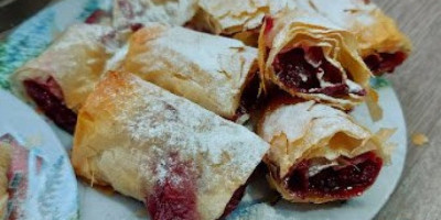 Prvu koru premazati uljem pa dodati drugu preko prve i nju premazati pa pobacati višnje. Malo po želji zašećeriti dodati kašiku dve prezli preko višanja , saviti ivice i uviti. Ređati u podmazan pleh.