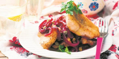 Filete ribe uvaljati u brašno, začiniti po ukusu, pa ispržiti u tiganju na vrelom ulju. U međuvremenu u voku ili većem tiganju na zagrejanom ulju dobro propržiti na rebarca isečen crveni luk, dodati kupus, šargarepu, kukuruz, pečurke i kapar, te mešati dok povrće ne omekša. U međuvremenu sjediniti šećer, sirće, sok od jabuke, soja-sos i skrob. Dodati u tiganj, začiniti i mešati dva minuta. Poslužiti uz ribu.