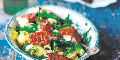 Krompir oguliti, iseći na komade, pa skuvati u slanoj, ključaloj vodi. Potom ga ocediti i staviti u adekvatnu činiju za salatu. Dodati iscepkanu skušu i iseckan peršun. Pomešati sok od limuna, med, senf i maslinovo ulje, posoliti i pobiberiti, te preliti salatu i promešati.