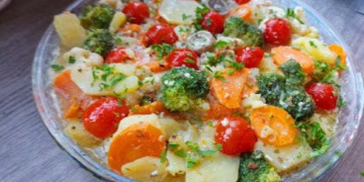 Krompir i šargarepu očistiti i iseći na kolutove. Karfiol i brokoli pokidati na cvetove . Šampinjone oprati ako su krupni iseći na pola . Naliti sve sa vodom i bariti 5-6 min ne više. Izvaditi u vanglu polako rešetko da se ohladi.