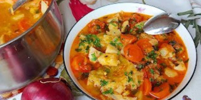 Ubaciti krompir na kockice i naliti da ogrezne i kuvati. Pred kraj dodati na kocke oljušten paradajz ili pire paradajz iz flaše.