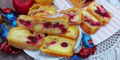 Umutiti 2 jaja sa šešećerom, pa dodati griz sa praškom za pecivo, žumanca, ulje, jogurt i sve izmešati. U mleko dodati šećer (po želji), pa sipati vanilin šećer i umućen puding. Sve kuvati minut, dva. Skloniti i malo prohladiti. Nakon toga, spremite očišćene višnje.