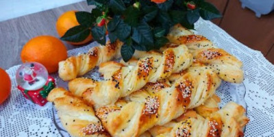 Opat razviti pola cm. Premazati žumancetom celu razvijenom površinu. Seći trake 1,5 cm širine pa uviti i ređati u pleh. Posutu susamom i odmah peći na 220 stepeni oko 20-30 minuta.