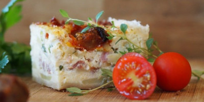 Dodajte polovinu iseckane pržene slanine, pa sipajte smesu u kalup i pospite ostatak slanine po vrhu.