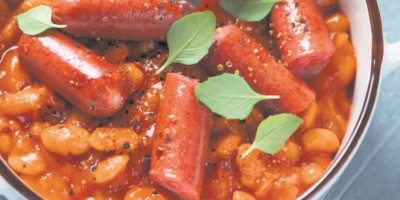 Pasulj naliti vodom i ostaviti da prenoći. Sutradan ga ocediti, staviti u šerpu, naliti vodom da ogrezne, pa kuvati dok ne proključa. Baciti vodu, naliti novu, vratiti na vatru, ubaciti lovor i lagano krčkati dok pasulj ne omekša. U međuvremenu crni luk iseći na rebarca, pa pržiti u ulju na umerenoj vatri dok ne omekša. Začiniti mlevenom paprikom, posoliti i pobiberiti, mešati još minut, pa skloniti sa ringle. U vatrostalnu činiju naizmenično ređati sloj pasulja, slok luka, dok se ne potroši sav materijal. Odozgo staviti kobasice i peći u rerni na 200 stepeni oko 30 minuta.