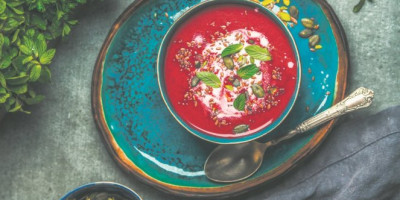 Sastojci: 3 srednje cvekle, 2 srednja krompira, crni luk, iseckan, 2 kašike maslinovog ulja, 2 lovorova lista, 2 kašike limunovog soka, so, biber, 1,5 l vode sa kockom pileće supe ili pileća supa, kisela pavlaka, tostirane semenke bundeve. Foto: Shutterstock