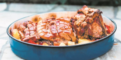 Meso iseći na veće komade, oprati i prosušiti. U okrugli pleh sipati po 50 mililitara ulja i vode, pa staviti meso. Okolo poređati očišćen i krupnije isečen crni luk, slaninu, krompir, šargarepu i papriku. Posoliti, pobiberiti, začiniti lovorom i ruzmarinom, preliti vinom, pa poklopiti i posudu čvrsto umotati u aluminijumsku foliju, da bi što manje tečnosti isparilo. Staviti u hladnu rernu, uključiti na 180 stepeni i peći oko tri sata.