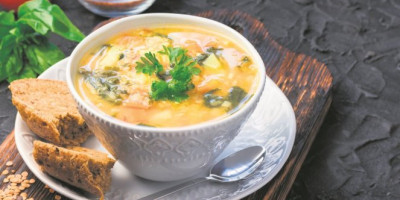 Pržite par minuta pa sipajte belo vino i supu od kockice i kuvajte još desetak minuta. Dok se kuva, prepecite nekoliko kriški hleba i rasporedite ih u porcije.