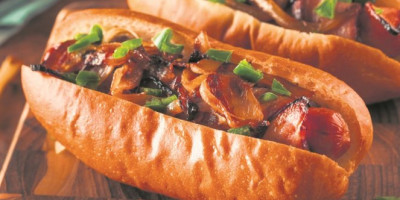 Luk iseći na rebarca, a papriku na trake, pa pržiti u tiganju na malo ulja dok povrće ne omekša i ne dobije lepu boju. Kobasice umotati u slaninu, staviti na pleh obložen papirom za pečenje, pa peći u rerni na 200 stepeni 25-30 minuta, uz povremeno okretanje, da kobasice dobiju lepu boju i slanina postane hrskava. Kifle prerezati po dužini, premazati senfom, kečapom ili pavlakom, ubaciti rolovane kobasice, pa odozgo rasporediti luk i papriku.