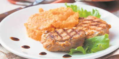 Krompir oguliti i iseći na kocke, staviti u šerpu, naliti vodom, posoliti, pa kuvati dok ne omekša, oko 15 minuta. Potom ga ocediti, vratiti u šerpu, izgnječiti u pire, pa dodati kiselu pavlaku, maslac, potisnuti beli luk, kašiku ulja, so i biber. Sve dobro sjediniti. Svinjski file iseći na medaljone, posoliti i pobiberiti, ispržiti u tiganju na malo ulja, pa poslužiti dok je toplo uz pire od slatkog krompira.