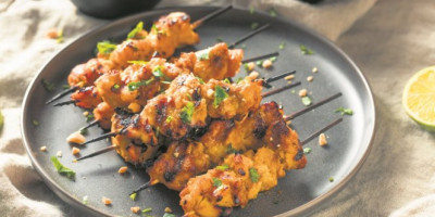 Piletinu iseći na kocke veličine zalogaja. Pomešati četvrt šolje kokosovog mleka, šećer, so, kari u prahu i kari pastu, dodati piletinu, dobro promešati i ostaviti da odstoji bar dva sata. U međuvremenu u šerpi kratko prokuvati preostalo kokosovo mleko, puter od kikirikija, soja sos, sirće, kari pastu, so, biber i vodu. Meso ređati na štapiće za ražnjiće, pržiti u tiganju dok piletina ne dobije lepu boju, pa poslužiti uz sos od kikirikija.