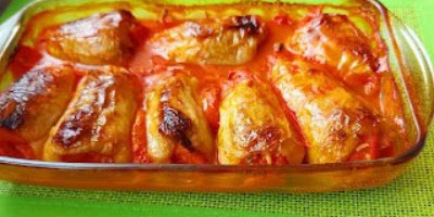 Poklopiti listovima krompira ili paradajza. Ređati u podmazan pleh. Sipati kuvan paradajz i premazati uljem paprike. Peći na 250 stepeni.