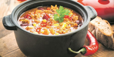 Priprema: Propržite crveni i beli luk, dodajte meso i propržite ga kratko na jakoj vatri. Naseckajte čili papriku (izvadite semenke za blaži ukus) i dodajte u šerpu zajedno sa čilijem u prahu, kuminom i origanom. Potom dodajte bujon, pa zgnječene komadiće paradajza. Čim proključa, kuvajte dalje na srednje jakoj vatri oko 30 minuta. Deset minuta pre kraja kuvanja dodajte pasulj i kukuruz, posolite i pobiberite.