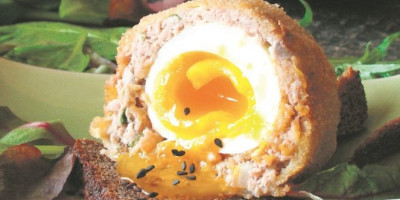 Tvrdo skuvati pet jaja. Iseckan crni luk kratko propržiti u tiganju, pa ga ocediti od viška ulja i dodati u meso. Posoliti, pobiberiti i začiniti paprikom, dodati namočen hleb, preostalo jaje, izgnječeni beli luk i peršun, te sve dobro sjediniti. Od dobijene smese formirati pet pljeskavica, na sredinu svake staviti po kuvano jaje, pa rukama oblikovati lopte. Uvaljati ih najpre u brašno, pa u umućena jaja i na kraju u prezle, te pržiti na umerenoj temperaturi oko 20 minuta.