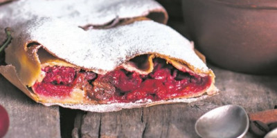 Pomešati višnje sa šećerom, vanilin-šećerom i pudingom. Rernu zagrejati na 180 stepeni. Prvu koru premazati uljem, pa je prekriti drugom korom. Nju takođe premazati uljem, pa odozgo staviti treću koru. Opet premazati uljem i rasporediti malo fila. Zarolati i pričvrstiti krajeve da fil ne bi iscurio tokom pečenja. Postupak ponoviti sa preostalim materijalom, pa štrudle složiti u podmazan pleh. Premazati ih uljem i peći u rerni oko 40 minuta. Posuti šećerom u prahu i poslužiti.