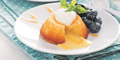 Otopiti čokoladu i maslac na pari, pa ostaviti sa strane da se prohladi. Umutiti jaja sa šećerom i vanilin-šećerom. Otopljenu i prohlađenu čokoladu sipati u smesu sa jajima. Na kraju lagano špatulom umešati i brašno. Keramičke posudice premazati uljem, posuti brašnom i u njih sipati smesu. Peći na 180 stepeni oko 20 minuta. Ostaviti desetak minuta da se prohlade, a potom pažljivo okrenuti na tanjir. Pre služenja dekorisati ih voćkicama i kuglom sladoleda.