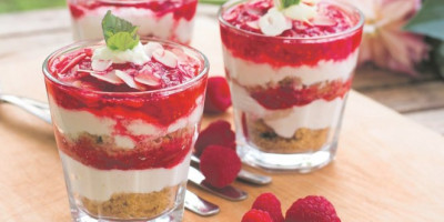 Mleveni keks pomešati sa sokom od limuna i pomorandže. Otopiti puter, prohladiti ga i dodati keksu, pa sve dobro promešati. Smesu raspodeliti u čaše i ostaviti u frižideru da se ohladi. Umutiti slatku pavlaku sa šećerom, dodati sir i dobro sjediniti mešanjem. Preko podloge od keksa sipati krem, a odozgo rasporediti odleđene maline. Postupak ponavljati sve dok ne potrošite materijal. Na kraju posuti listićima badema. Staviti u frižider da se čizkejk ohladi, pa poslužiti.