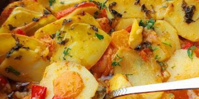 Kad povrće omekne, skiniti sa šporeta ubaciti listiće krompira između povrća kao i paradajz na kriške. Na kraju dodati sečen peršunov list.