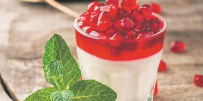 Slatku pavlaku pomešati sa šećerom u prahu i malo soli, pa zagrejati na ringli pazeći da ne proključa. Dodati kašičicu i po želatina i mešati dok se smesa ne zgusne. Rasporediti u čaše i staviti u frižider da se ohladi i stegne. Kašičicu želatina razmutiti u četvrt šolje vode, dodati sok od nara i šećer, pa kuvati na umerenoj vatri dok ne počne da se zgušnjava. Preliti preko panakote, ohladiti u frižideru i poslužiti.