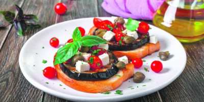 Patlidžan iseći na kolutove, posoliti, ostaviti da odstoji desetak minuta, pa ocediti. Posoliti, pobiberiti i premazati uljem, pa ispeći u gril tiganju da patlidžan dobije lepu boju. Kriške hleba staviti u pleh, preliti sa malo ulja, pa odozgo poslagati grilovani patlidžan. Dodati iseckan čeri paradajz, kapar i fetu, preliti sa još malo ulja, začiniti bosiljkom i majčinom dušicom, pa kratko zapeći u rerni na 200 stepeni. Poslužiti toplo.