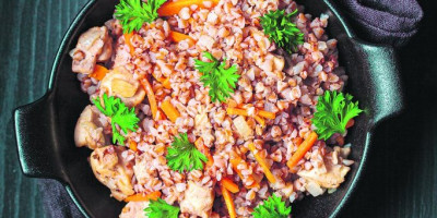 Mešati sedam-osam minuta, te dodati heljdu. Krčkati dva minuta, preliti supom, posoliti, pobiberiti i začiniti majčinom dušicom, te kuvati uz mešanje još 15-20 minuta.