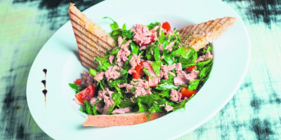 Rukolu i zelenu salatu oprati, ocediti, iseckati, pa staviti u činiju za salatu. Zatim u činiju ubaciti oceđenu tunjevinu i čeri paradajz, pa promešati. Sjediniti izgnječen beli luk, ulje, senf, med, sirće, so i biber, preliti salatu, još jednom promešati i odmah poslužiti.