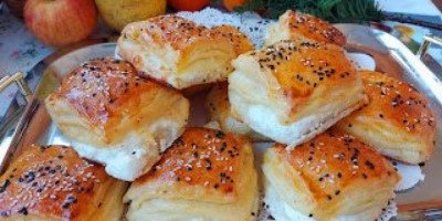Preseći svako testo po sreeni i popreko da dobijemo lepe lisnate kocke. Pokriti folijom 20 minuta, pa premazati žumancetom i posuti susamom. Stavljamo u vruću rernu koja je zagrejana na 220 stepeni C peći da lepo porumene oko 25 -30 minuta.