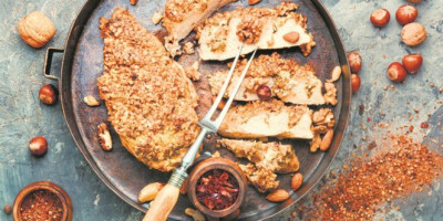 U većoj činiji pomešati mleko i pavlaku za kuvanje, pa dodati meso isečeno na deblje šnicle. Sjediniti, poklopiti i staviti u frižider da odstoji nekoliko sati. Pomešati iseckane bademe, orahe, lešnike, prezle, brašno, so, biber i mlevenu papriku. Piletinu uvaljati u pripremljenu smesu, pa ređati na rešetku ili pleh obložen papirom za pečenje. Peći u rerni na 220 stepeni 12 minuta, te okrenuti i peći još toliko. Poslužiti dok je toplo, uz umak po ukusu.
