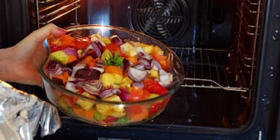 Povrće posoliti, pobiberiti, , dodati prezle, origano, ,mlevenau paprika. ulje i izmešati. Sipati u pleh uljem premazati četkicom i malo pokriti aluminiskom folijom oko 30 minuta, otkriti i peći oko sat vremena.