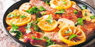 Meso i pečurke poređajte u vatrostalnu činiju, prelijte sosom od vina, a preko poređajte kriške limuna. Pecite desetak minuta na 200 stepeni. Služite toplo uz prilog po želji.