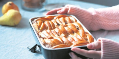 U veću posudu staviti ovsene pahuljice, malo mleka, so i dve šolje vode, dobro promešati, pa poklopiti i ostaviti da odstoji preko noći, da se pahuljice natope. Sutradan rernu zagrejati na 180 stepeni, a pleh obložiti papirom za pečenje. Jaja penasto umutiti, dodati mleko, med, vanilu, maslac i sodu bikarbonu, sjediniti, pa začiniti cimetom i muskatnim oraščićem. Na kraju dodati jednu izrendanu krušku i oceđene pahuljice. Izliti u pleh, odozgo rasporediti kruške isečene na kriške, pa peći u rerni oko 45 minuta.