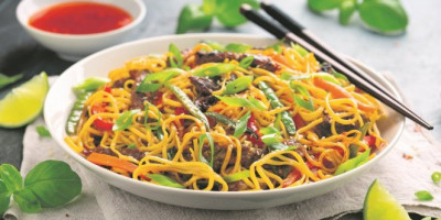 U manjoj posudi pomešati soja-sos, ojster-sos, šećer, rendani đumbir, izgnječeni beli luk, susamovo ulje, so i biber. Nudle skuvati u ključaloj vodi prema uputstvu s pakovanja. U većem tiganju na zagrejanom ulju propržiti ramstek isečen na trake, pa dodati pečurke isečene na listiće, boraniju i šargarepu isečenu na štapiće. Pržiti pet minuta, te dodati oceđene nudle i mešati još tri minuta. Preliti pripremljenom sosom, sve dobro sjediniti, pa odmah poslužiti.